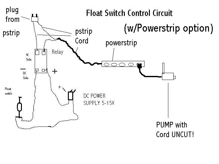 The drawing shows how the relay, float switch, and power supply get wired together.