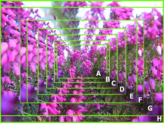 Although not to scale, the image below shows the relationship of size between a 640 x 480 resolution (A) and a 4 megapixel resolution (H) representing a print size of 8 x 5.33 in or 20.3 x 13.5 cm. NOTE: colour printers, or the software driver that they use are able to interpolate an image to larger dimensions. Interpolation involves the use of algorithms to "invent" extra pixels that are inserted between existing ones in the image to increase the overall size of the image. This is a process that most printers use to smooth the appearance of the image. However, if the interpolation is too great ? the image size is increased too much ? then artefacts will appear in the print. Finally, many photo-printing programs perform the changes from 72 DPI to a PPI value automatically, adjusting the parameters to the image size requested by the user. However, to get the best results, it is advisable to avoid printing a low-resolution image at too large a size.