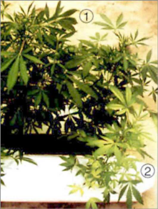 Both of these leaves in figure 6 and figure 7 are from the same plant. It could be over fertilization, but more likely it is due to the pH being off. Too high or too low a pH can lock up nutrients in the form of undisolvable salts and compounds, some of which are actually toxic to the plants. What then happens is the grower then tries to supplement the plants diet by adding more fertilizers, throwing off the pH even more and locking up even more nutrients. This type of problem is seen more often in soil mixes, where inconsistent mixing of the medium's components leads to "hot" spots.